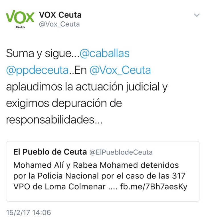 Redacción. Vox Ceuta a través de su cuenta de Twitter, aplaude la actuación de la justicia en el asunto de las viviendas de Loma Colmenar y se suma a la petición de otros grupos políticos locales, exigiendo la depuración de responsabilidades políticas tras las últimas detenciones producidas en lo que ya se conoce como «caso Emvicesa» y que han implicado a varios miembros del gobierno y de la oposición local.