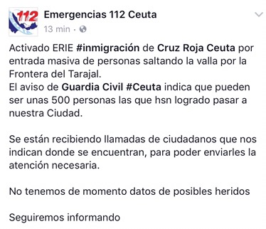 Redacción. Según informa en su página de Facebook el 112 de Ceuta se podría estar produciendo en estos momentos un asalto masivo de inmigrantes a la altura del perímetro fronterizo del Tarajal. Seguiremos informando…