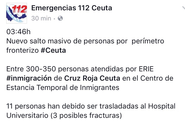 Redacción. Según informan los servicios de emergencia del 112, sobre las tres de la madrugada se ha producido un nuevo asalto masivo a la valla fronteriza de Ceuta, en esta ocasión habrían sido entre 300 y 350 inmigrantes, que se sumarían a los 500 que el pasado viernes también lograron acceder a la Ciudad. Seguiremos informando…