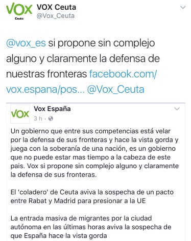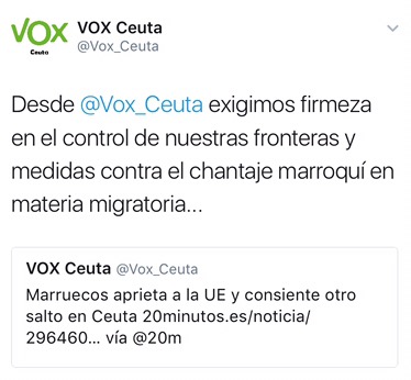 Comunicados. A través de un comunicado y como aparece reflejado en su cuenta oficial de Twitter, VOX Ceuta ha exigido del gobierno que preside Mariano Rajoy, firmeza en el control de las fronteras nacionales, así como la puesta en marcha de medidas para presionar a Marruecos a que ponga fin al «chantaje que en materia migratoria» ejerce sobre España y la UE.
