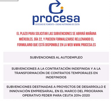Digitales. El Boletín Oficial de la Ciudad (BOCCE) publica en su edición de hoy martes las convocatorias de los programas de ayuda al autoempleo, contratación indefinida y subvenciones para el desarrollo de proyectos de innovación empresarial de Procesa, sociedad pública de la Consejería de Economía, Hacienda, Administración Pública y Empleo, y que están cofinanciadas con cargo al Fondo Social Europeo (FSE) y al FEDER, en el marco de los Programas Operativos FSE y FEDER para Ceuta 2014-2020.