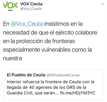 Comunicados. VOX Ceuta a través de un comunicado pone de manifiesto la necesidad de que el Ejército colabore junto con las Fuerzas y Cuerpos de Seguridad del Estado, en las tareas de refuerzo y control del perímetro fronterizo de Ceuta. Como así también lo refleja en su cuenta oficial de Twitter, ante la noticia publicada en los medios de que el Ministerio del Interior asigna 40 guardias civiles más a las tareas de vigilancia fronteriza, VOX Ceuta insiste «en la necesidad de que el ejército colabore en la protección de fronteras especialmente vulnerables como la nuestra» apuntan en la red social.