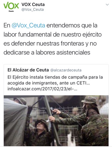 En la misma línea y haciéndose eco de la noticia publicada por este medio en la que se informa de las labores que viene realizando el ejército para acondicionar campamentos auxiliares para inmigrantes ante la saturación del CETI de Ceuta, desde VOX Ceuta también entienden que «la labor fundamental de nuestro ejército es defender nuestras fronteras y no dedicarse a labores asistenciales, para esos menesteres existen otras organizaciones» indican en su nota y en su cuenta oficial».