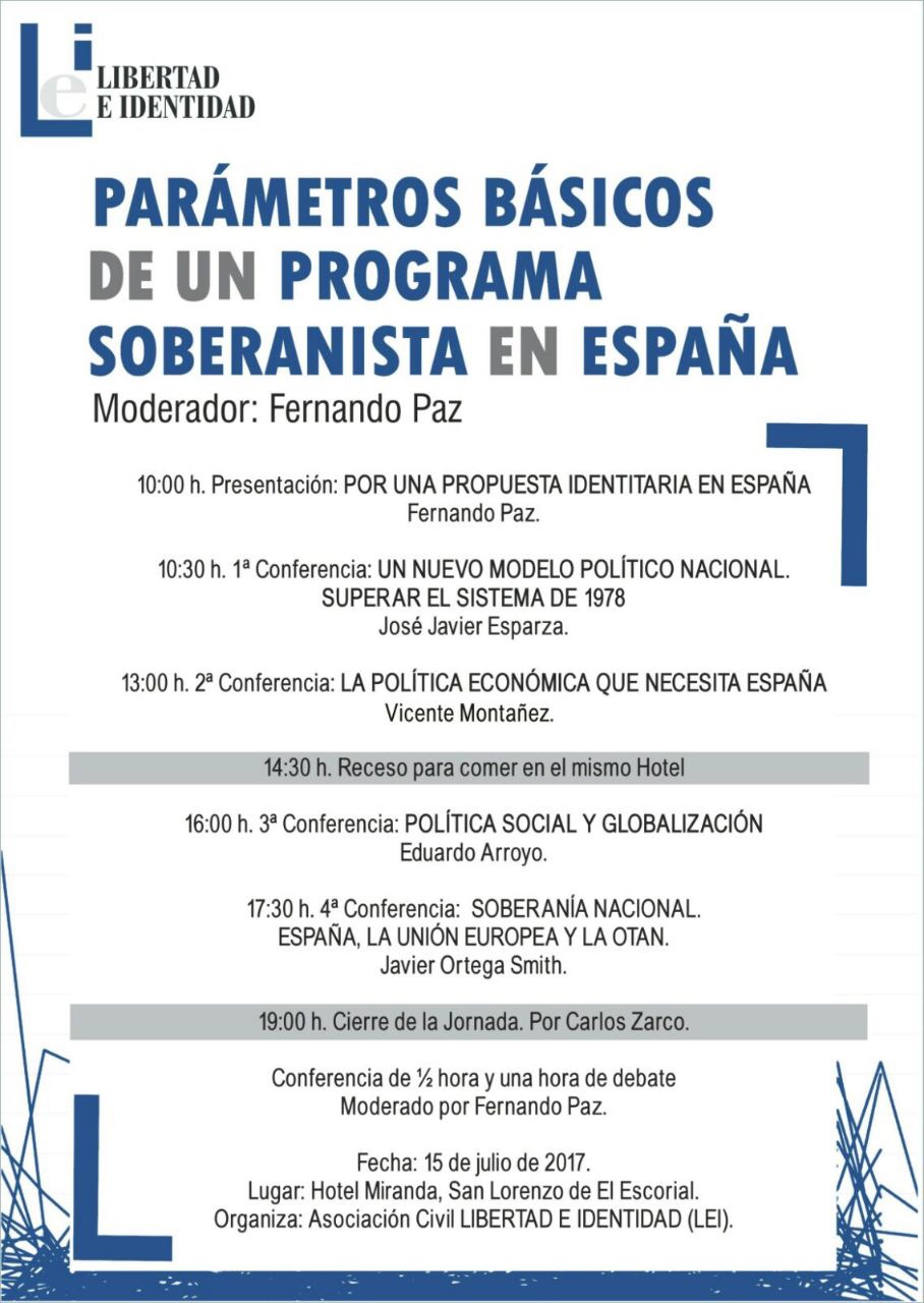 La jornada será abierta por el historiador Fernando Paz quien hablará de “Parámetros básicos de un programa soberanista en España“. La intervención siguiente versará sobre “Un nuevo modelo político nacional: Superar el sistema de 1978“, y correrá a cargo de José Javier Esparza, al que diversas fuentes sitúan como el ideólogo de la operación unitaria de estas fuerzas identitarias.