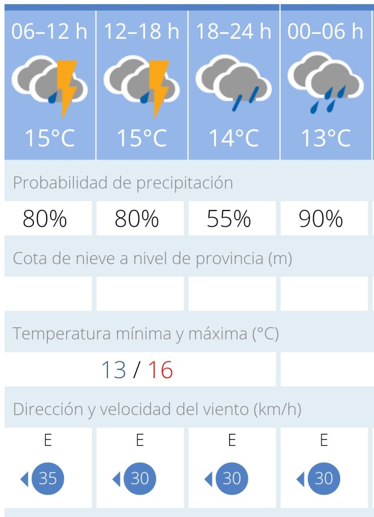 Así, se producirán lluvias débiles que podrían dejar alrededor de unos 0.1 litros por metro cuadrado, aproximadamente a las 12:00, mientras que sobre las 14:00 se sucederán 0.6 litros. Además, tanto por la mañana como por la tarde podrían aparecer tormentas. Se esperan pocos cambios de temperaturas con respecto a los registros de ayer, alcanzando los 16 grados de máxima y los 14 de mínima. El viento de dirección este será característico durante la fecha de hoy.
