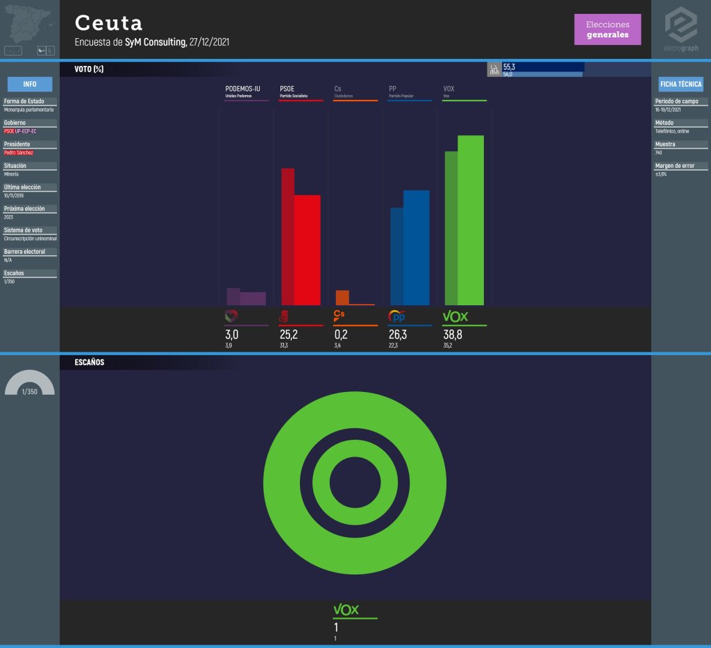 Según la encuesta realizada por SyM Consulting, Vox acumularía más del 32,86% de los votos, lo que le valdría contar con entre 8 y 9 diputados en la Asamblea de Ceuta. El PP sería segunda fuerza, llegando a los 6 diputados con algo más del 23,83 % de los votos y el PSOE le seguiría en la misma cifra, con 6 representantes y el 22,08% de los votos.