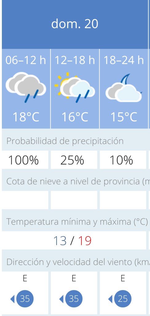 La mañana estará protagonizada por lloviznas débiles que dejarán apenas 0.2 litros por metro cuadrado alrededor de las 11:00; evolucionarán a una tarde sin agua. Asimismo, hay muchas posibilidades de que aparezcan tormentas en ambas franjas horarias. Las temperaturas no cambiarán demasiado con respecto a ayer, con unas máximas de 19 grados y unas mínimas de 13 (pero con una sensación térmica máxima de 18 grados) . Soplará viento de dirección este.