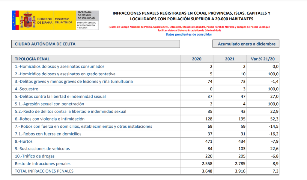 E.A.C. Un total de 3.916 infracciones penales. Este es el balance de criminalidad que deja 2021 en la ciudad, en un año en el que las infracciones han crecido un 7,3% y en el que los robos se han disparado. Y es que, según los datos publicados por el Ministerio del Interior, los robos con violencia e intimidación han crecido un 52,3% pasando de 128 en 2020 a 195 en 2021. También lo han hecho las sustracciones de vehículos, de las que se han registrado 103 durante el pasado año frente a las 84 del anterior, lo que supone un incremento del 22,6%.