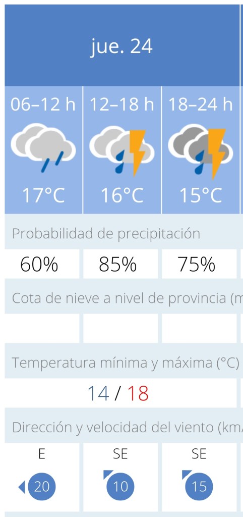 Así pues, caerán lluvias débiles que dejarán alrededor de 0.1 litros por metro cuadrado sobre las 08:00 y 0.2 litros en torno a las 17:00. Del mismo modo, será muy probable que se hagan sentir tormentas por la mañana y por la tarde pueden aparecer ciertas rachas de lluvia y viento. Los termómetros situarán la temperatura máxima en valores similares a los de ayer, con 18 grados, y las mínimas rondarán los 14, muy próximas a los 13 de ayer . Se experimentarán vientos de componente este.
