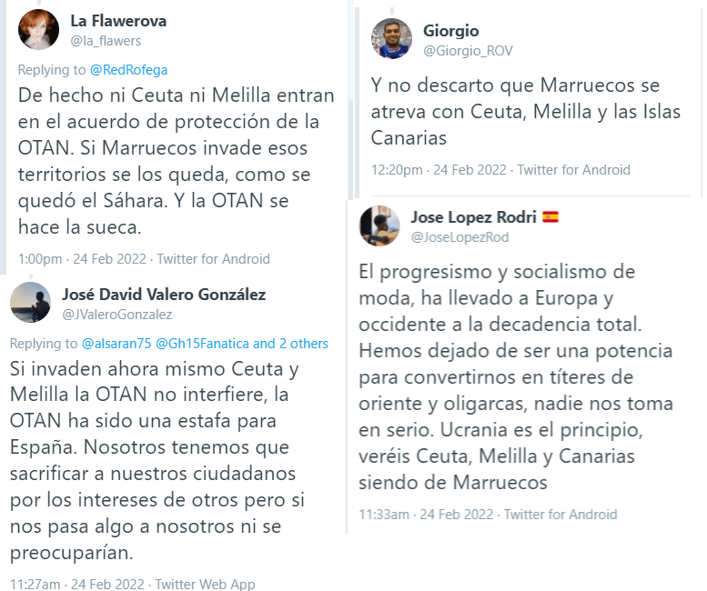 Incluso un tuit de @Javiermartin1e señala: «Ahora, y no en otro momento, es cuando España debe reivindicarse en la OTAN e implicar a Ceuta y Melilla, y si no ¿para cuando?». Otro usuario, con el alias de @PedromartinezCT afirma: «Si ahora mismo entrasen en Ceuta y Melilla, incluso en Canarias, dudo que tuviésemos apoyos claros (mira EEUU) y, seguramente, vistos nuestros líderes, hasta pondríamos la alfombra roja».