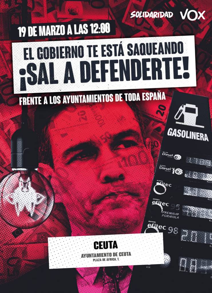 E.A.C. Este sábado, a las 12.00 horas y frente al Palacio Autonómico, VOX y Solidaridad se concentran para protestar por las políticas del Gobierno que Sánchez que han llevado “al empobrecimiento de los españoles y, especialmente, de los ceutíes”. Así lo destaca el presidente de VOX Ceuta, Juan Sergio Redondo, que anima a los ciudadanos a sumarse a esta movilización que, al margen de siglas, pretende protestar por la continua subida de precios.