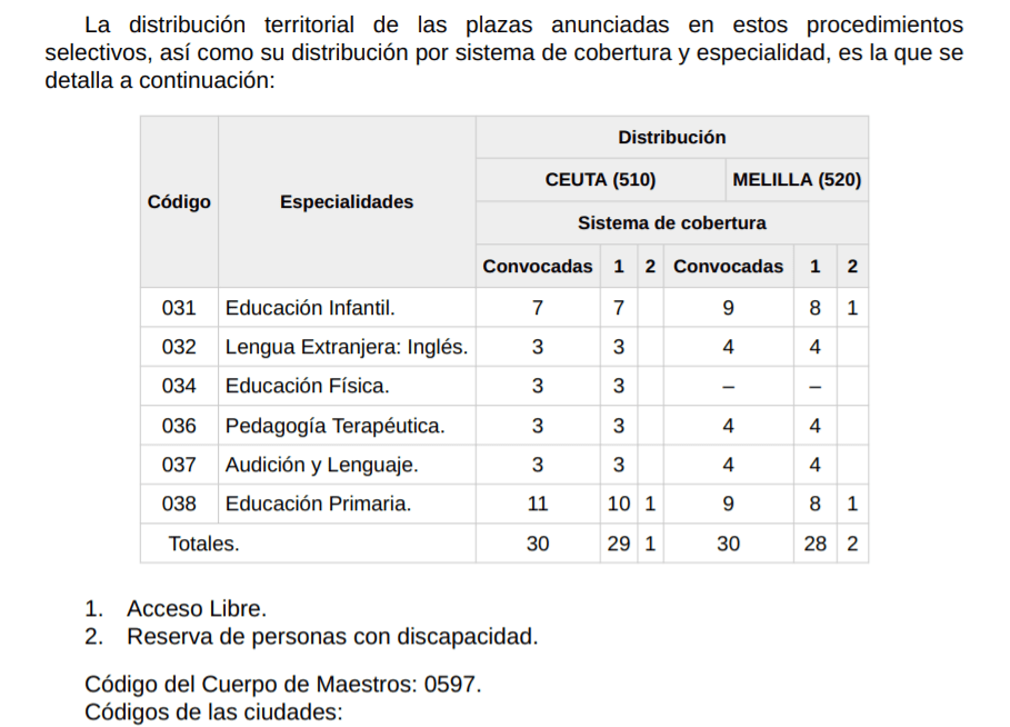 En concreto, se convocan procedimientos selectivos para cubrir 60 plazas del Cuerpo de Maestros para centros docentes del ámbito territorial de gestión del Ministerio de Educación y Formación Profesional. Las especialidades son: Educación Infantil (7 plazas convocadas de acceso libre en Ceuta, 9 en Melilla de las cuales 1 reservada para personas con discapacidad); Lengua Extranjera – Inglés (3 plazas en Ceuta, y 4 para Melilla); Educación Física (3 plazas para Ceuta); Pedagogía Terapéutica (3 plazas convocadas en Ceuta; 4 en Melilla); Audición y Lenguaje (3 en Ceuta, 4 en Melilla); y Educación Primaria (11 plazas convocadas para Ceuta, de las cuales 1 reservada para personas con discapacidad, y 8 en Melilla, de estas 1 reservada para personas con discapacidad).