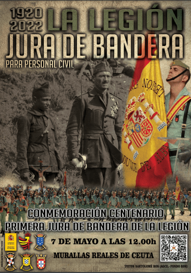E.A.C. La Comandancia General de Ceuta, recuerda que el próximo día 7 de mayo a las 12 horas, en las Murallas Reales de Ceuta, tendrá lugar una Jura de Bandera con motivo del centenario de la primera Jura de Bandera de La Legión para todo aquel personal civil que desee prestar juramento o promesa ante la Bandera de España.