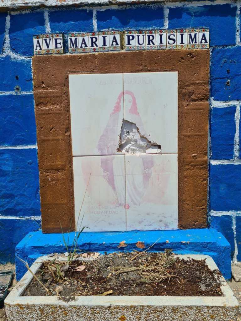 El pasado mes de mayo, los fieles informaron del destrozo de la Cruz, que posteriormente procedieron a adecentar limpiando el lugar y plantar cactus en el macetero. Ahora, en la visita celebrada este sábado, con el objeto de rezar y reponer dicha Cruz, ha aparecido profanada la imagen de la Virgen María y además de los maceteros rotos.