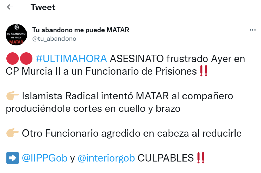 E.A.C. Tal y como informa la Asociación Profesional de Trabajadores Penitenciarios -Tu Abandono Me Puede Matar (TAMPM), un preso islamista radical, de nacionalidad española pero radicalizado, que estaba en el artículo 91,3 RP (serán destinados a departamentos especiales aquellos penados clasificados en primer grado que hayan sido protagonistas o inductores de alteraciones regimentales muy graves, que hayan puesto en peligro la vida o integridad de los funcionarios, autoridades, otros internos o personas ajenas a la Institución, tanto dentro como fuera de los Establecimientos y en las que se evidencie una peligrosidad extrema), pero que le dieron el segundo grado para que pudiera estar en régimen ordinario.