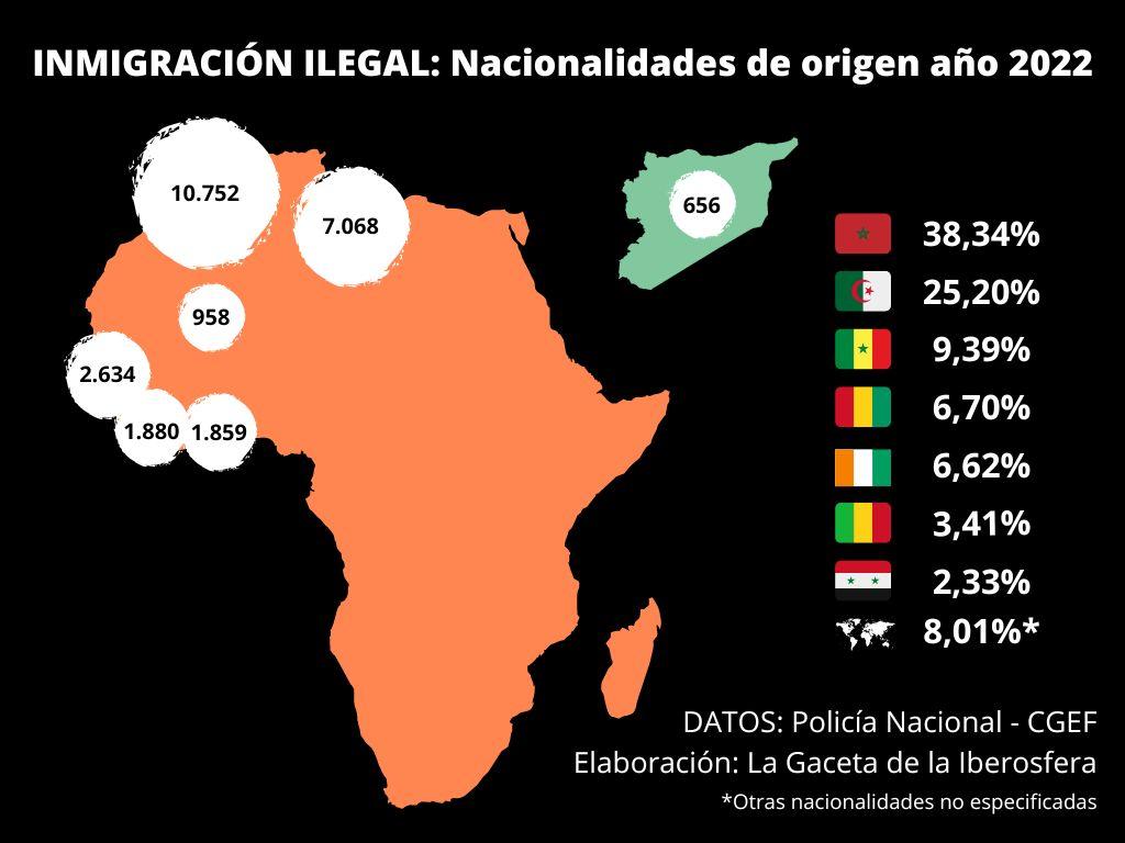 Rubén Pulido. La Gaceta de la Iberoesfera. Los diferentes balances del Ministerio del Interior y del Alto Comisionado de las Naciones Unidas (ACNUR) sitúan el flujo oficial de entradas de ilegales durante el año 2022 en más de 31.000. Lo que ambos organismos no referencian –y llevan sin hacerlo desde el año 2020– son las nacionalidades de origen de estos inmigrantes, aunque, según un informe policial al que ha tenido acceso La Gaceta de la Iberosfera, más del 60% son nacionales de Marruecos y Argelia.
