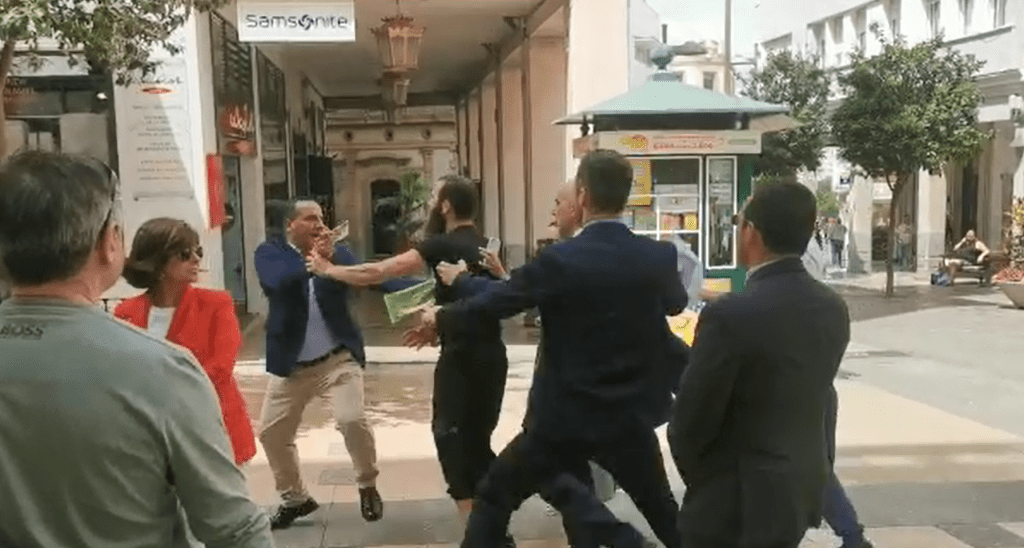 Inmediatamente, varios miembros del grupo comenzaron a grabar lo que estaba sucediendo ante lo que el individuo, acompañado por su mujer y dos hijos menores de edad, se puso más agresivo. Ante su actitud, otro individuo se le unió en los insultos hacia los miembros de VOX, y la agresividad llegaba hasta el punto de que tuvieron que sujetar al primer hombre que había iniciado el altercado. Fue este, además, el que se dirigió hacia uno de los asesores de VOX para agredirle e intentar quitarle el teléfono con el que estaba grabando la escena.