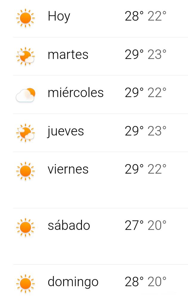 Mañana algo nubosa hasta el mediodía, despejándose después. Temperaturas similares al lunes: máximas alrededor de 28–29 °C, mínimas en 21–23 °C. Vientos del sudeste suaves