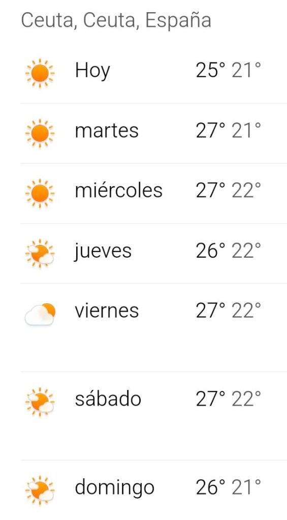 Domingo 27: Soleado y húmedo, temperatura máxima de unos 26 °C y mínima de 21 °C.